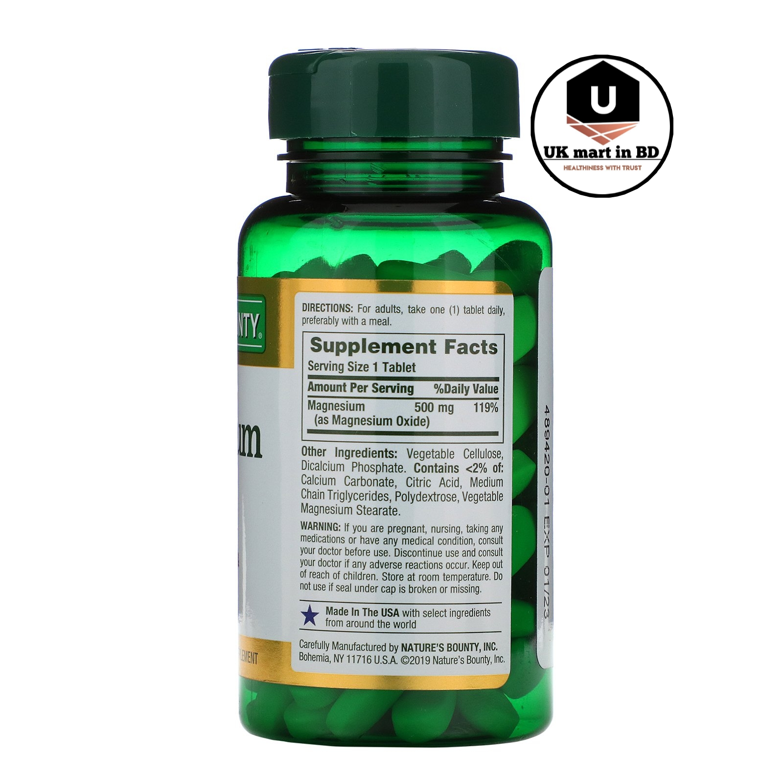 Nature’s Bounty® Magnesium provides 125% of the daily recommended value for this important mineral in just one tablet. Magnesium is essential for supporting bone health, and plays an important role in maintaining bone mineralization.* As a component in over 200 enzymes in the body, Magnesium is also involved in muscle contractions, nerve impulses, energy metabolism and protein formation.*